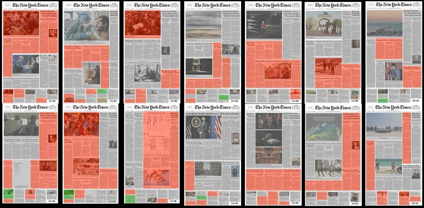 Нравится картинка, где были взяты случайные 2 недели первых полос NYT и закодированы цветами: красный – "люди плохо поступают друг с другом", зеленый – "люди хорошо поступают друг с другом", серый – "делают что-то нейтральное".