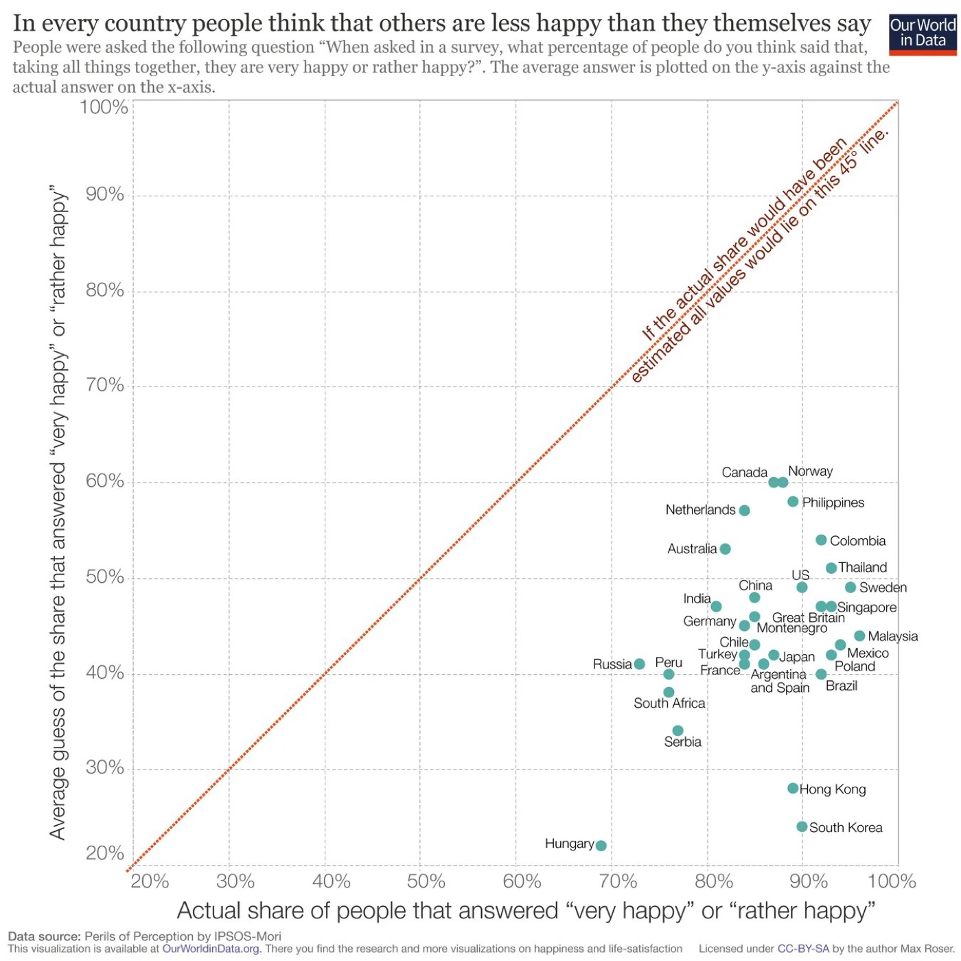 Например, когда людей спрашивают насколько они счастливы – в среднем все отвечают что "довольно счастливы". Но если спросить, как по их мнению чувствуют себя другие, то ответ: "они не очень счастливы".