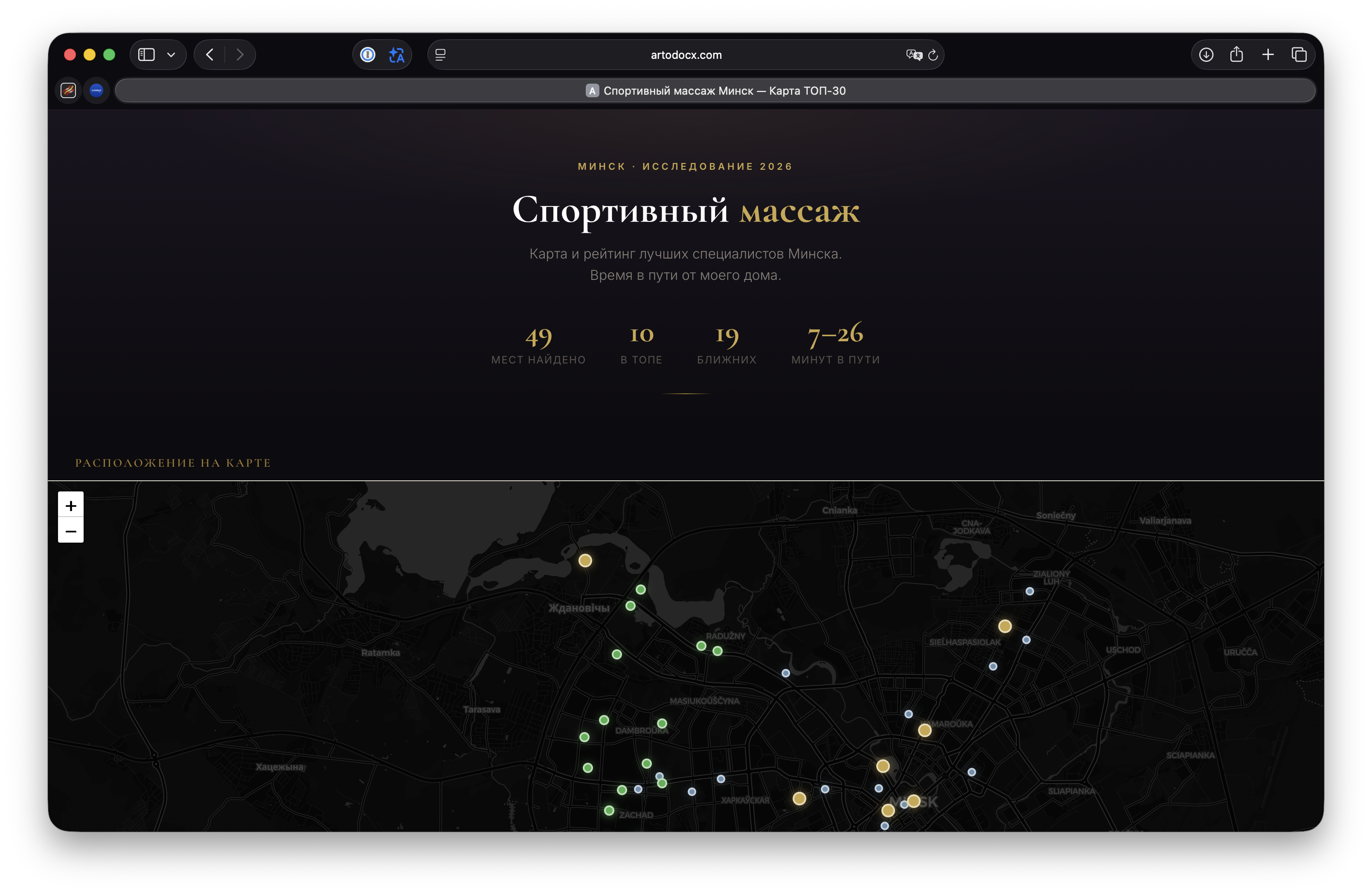 Или другой случай. Закрылся массаж, куда ходил последние годы. Попросил агента подобрать спортивные массажи в Минске, и сразу нанести на карту со временем дороги от меня, чтобы визуально выбрать куда ближе ездить. Результат, созданный одним запросом (на самом деле я даже не писал, а просто надиктовал за 20 сек через Wispr) и без доработок, оцените сами. Внизу страницы полная таблица, пользуйтесь)) https://artodocx.com/massage-map