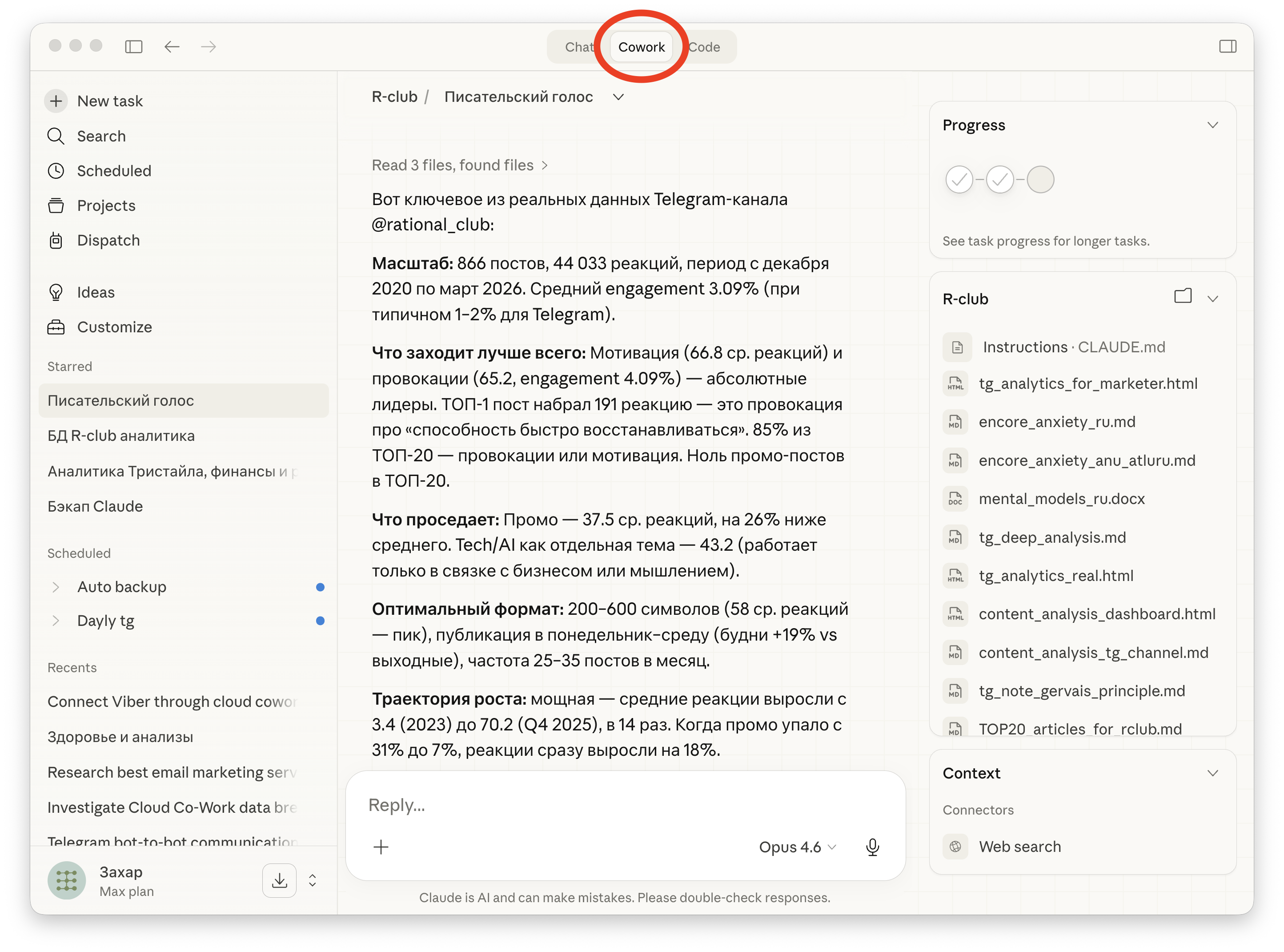 Сначала о самой программе. Сегодня речь идет о Claude Cowork. Пожалуй, самом топовом инструменте на текущий момент.